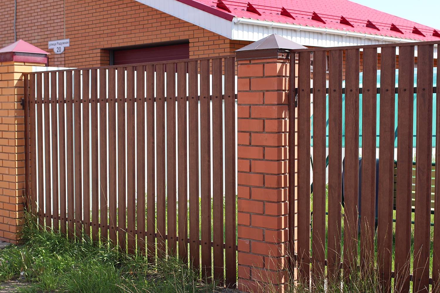 Заборы и ограждения из евроштакетника с кирпичными столбами 8 соток в Шатуре